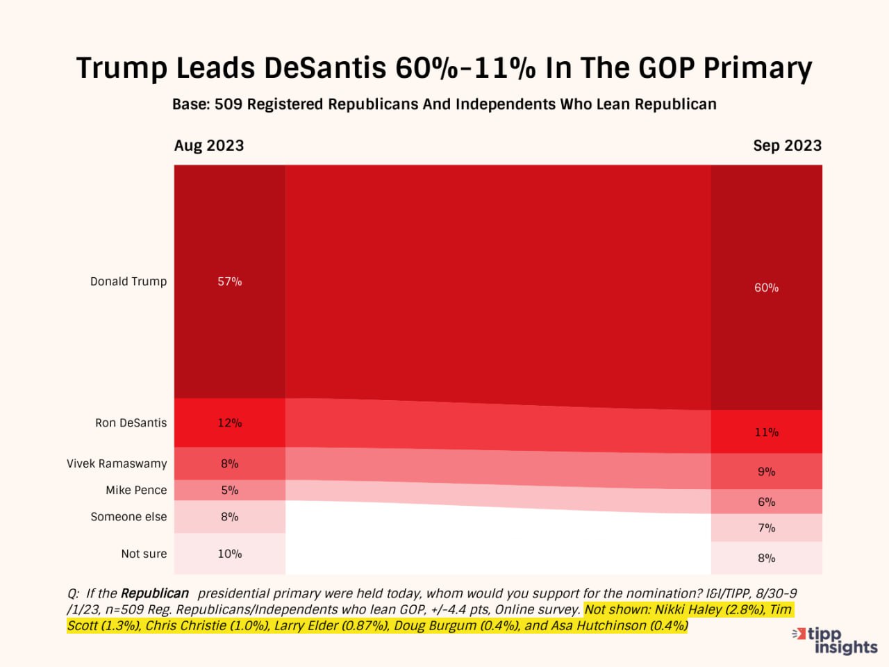 Если в августе у Трампа было 57% поддержки при 12% у Десантиса - то в сентябре Трамп имеет уже 60%, а его ближайший соперник просел на процент.