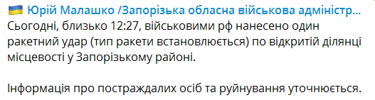 "Сегодня, около 12:27, военными РФ нанесен один ракетный удар (тип ракеты устанавливается) по открытому участку местности в Запорожском районе", - написал Малашко.