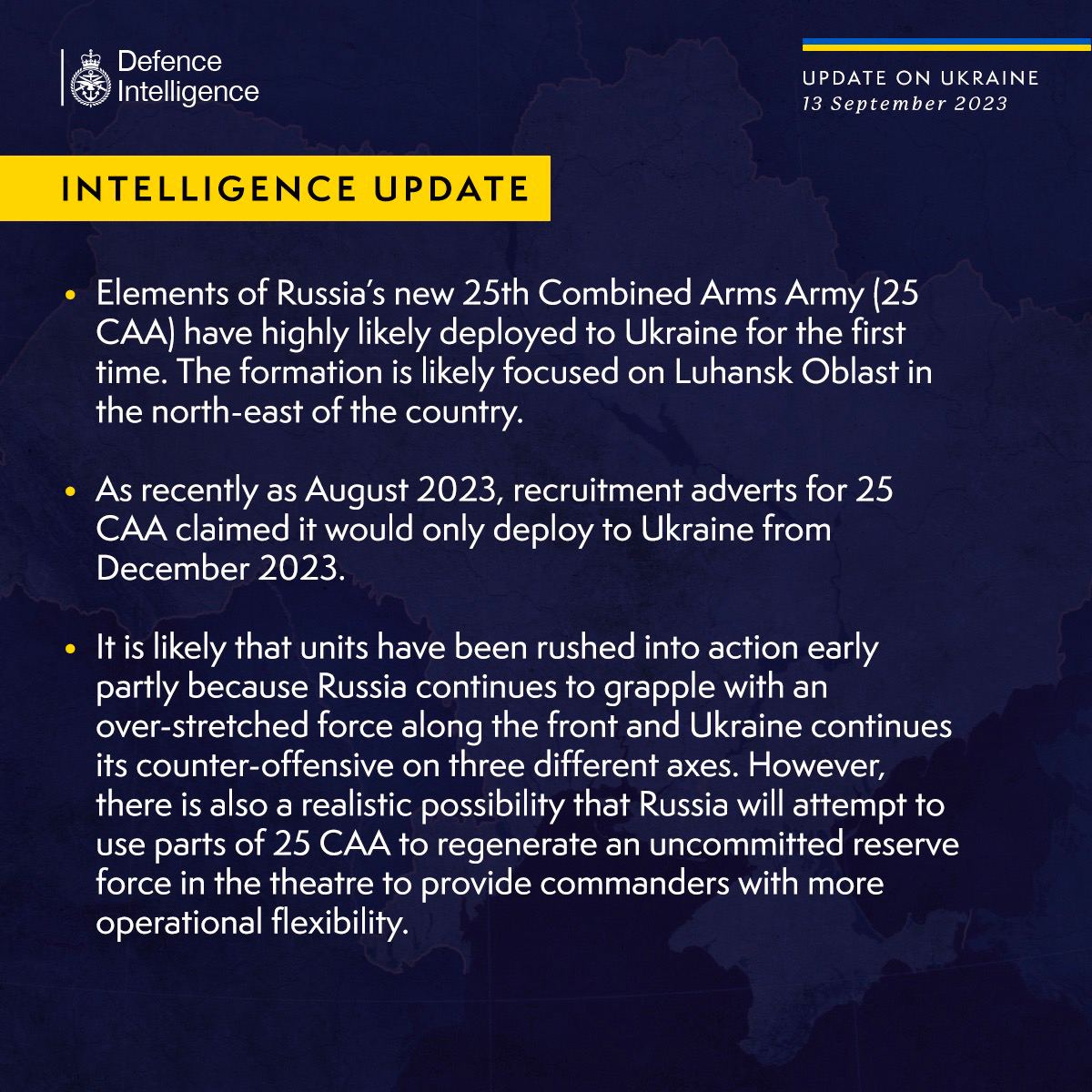 По данным британской разведки, в августе 2023 года, в объявлениях о наборе военнослужащих в 25-ю армию утверждалось, что она будет развернута в Украине только с декабря 2023 года.