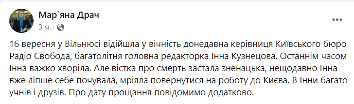 "В последнее время Инна тяжело болела. Но весть о смерти застала врасплох, недавно Инна уже лучше себя чувствовала, мечтала вернуться на работу в Киев. У Инны много учеников и друзей. О дате прощания сообщим дополнительно", - написала Драч.