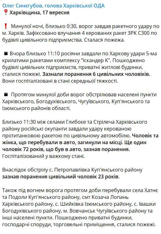 Также он привел данные по ракетному удару, которые произошел вчера днем. Был прилет пяти крылатых ракет комплекса "Искандер К" по Холодногорскому району Харькова.