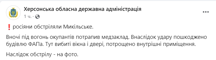 Сегодня ночью российские войска обстреляли медицинское учреждение в Никольском Херсонской области. Повреждено здание фельдшерско-акушерского пункта.