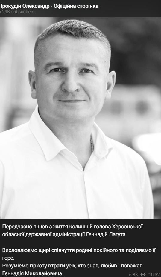 "Преждевременно ушел из жизни бывший глава Херсонской облгосадминистрации Геннадий Лагута. Выражаем искренние соболезнования семье покойного и разделяем ее горе", - написал Прокудин.