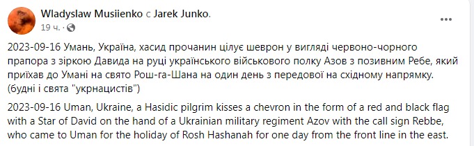 "2023.09.16 Умань, Украина, хасид-паломник целует шеврон в виде красно-черного флага со звездой Давида на руке украинского военного полка "Азов" с позывным Ребе, который приехал в Умань на праздник Рош ха-Шана на один день с передовой на восточном направлении (будни и праздники "укронацистов")", — подписал опубликованное фото его автор в соцсети.