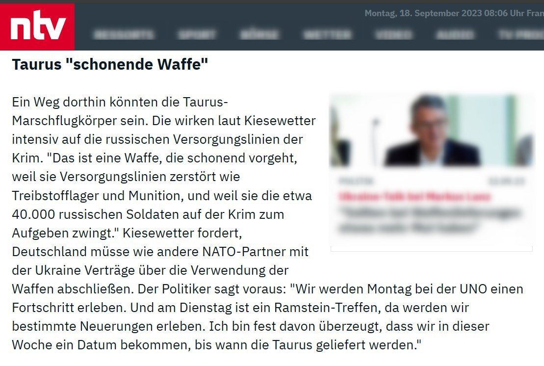 09.10 Немецкий депутат Бунестага Родерих Кизеветтер (ХДС) прогнозирует, что Германия примет решение о поставках Украине дальнобойных ракет Taurus уже в ближайшие дни.