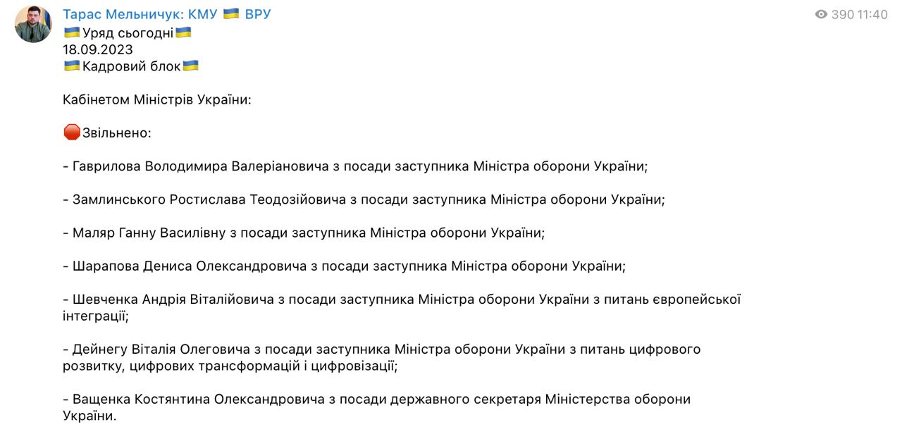 12.00 Кабмин уволил всех заместителей министра обороны, сообщил представитель правительства в Раде Тарас Мельничук.