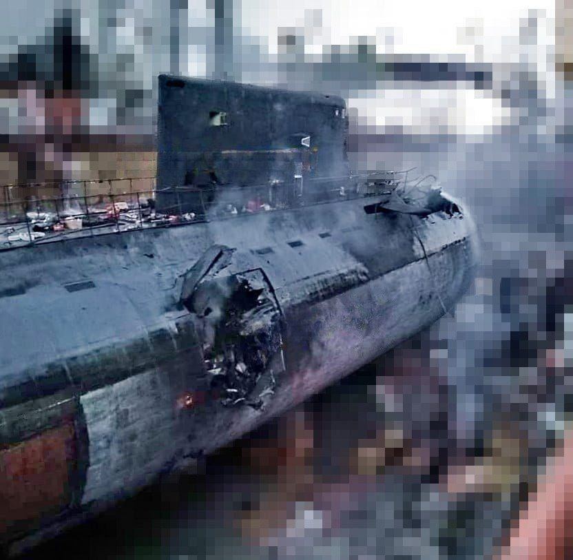 Военные телеграм-каналы сегодня опубликовали фото российской подлодки "Ростов-на-Дону", поврежденной 13 сентября в результате ракетного удара по судоремонтному заводу в Севастополе.