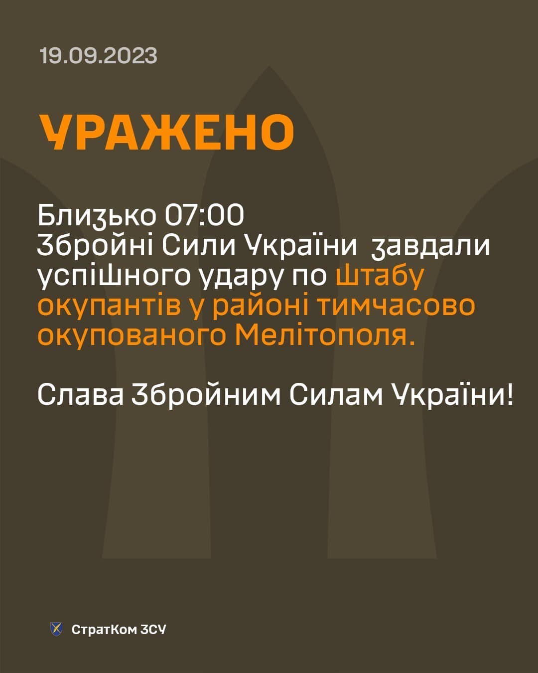 В Страткоме ВСУ сообщили, что утром 19 сентября украинские военные поразили штаб РФ возле Мелитополя.