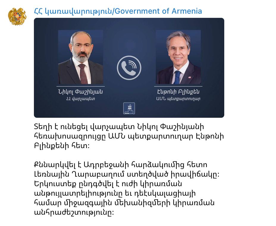 Премьер-министр Армении Никол Пашинян обсудил ситуацию в Нагорном Карабахе с госсекретарем США Энтони Блинкеном.