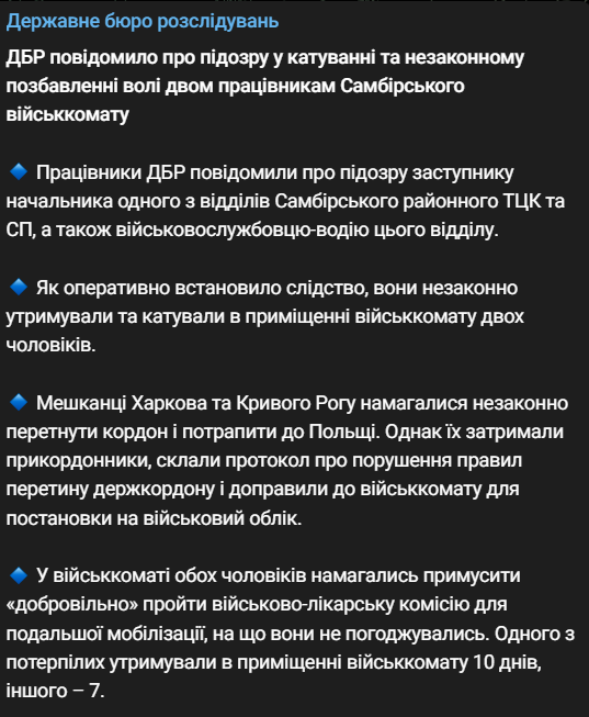 После публикации видео ГБР задержало двух сотрудников военкомата Самбора, которые избивали незаконно удерживаемого мужчину. Он находился в ТЦК с 12 сентября. Его морили голодом, избивали и издевались, чтобы он "добровольно" прошёл военно-врачебную комиссию и отправился в армию.