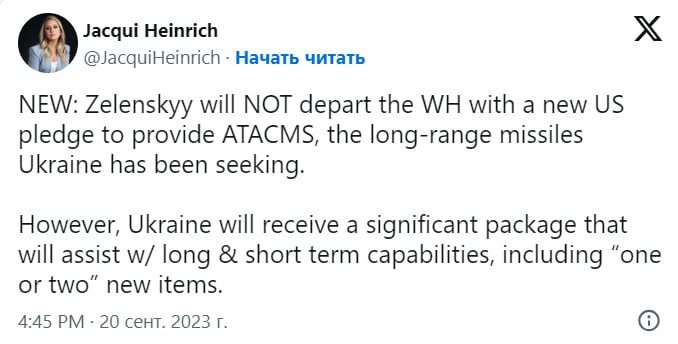 "Украина не получит ATACMS, тактические баллистические ракеты дальностью 190 миль, которые Зеленский срочно запросил для уничтожения российских войск в Крыму и на других контролируемых Россией территориях «в ближайшее время», заявляют официальные лица. Новости приходят за день до визита Зеленского в Белый дом к Байдену", – написал Томлинсон.