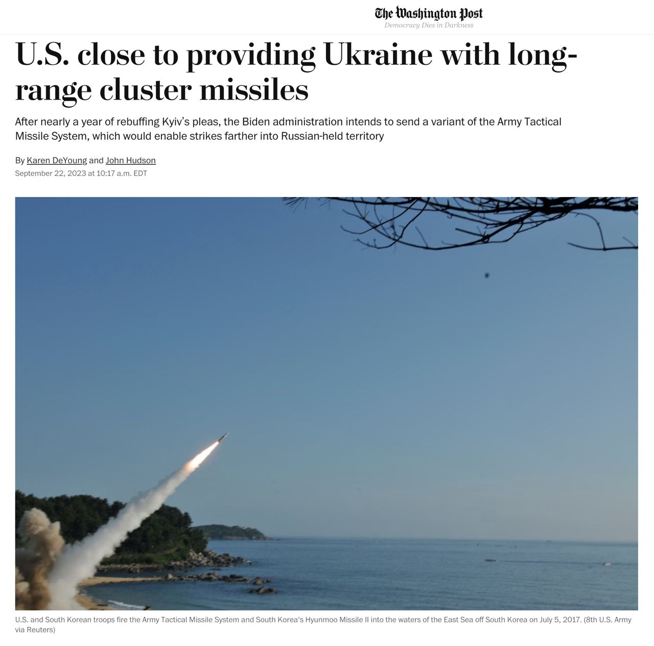 США близки к передаче Украине дальнобойных ракет ATACMS, только оснащенных кассетными бомбами, а не одиночной боеголовкой.