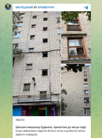 Мэр Кременчуга Виталий Малецкий предупреждает людей, чтобы не ходили в районе прилета – теперь из-за угрозы падения стекол.