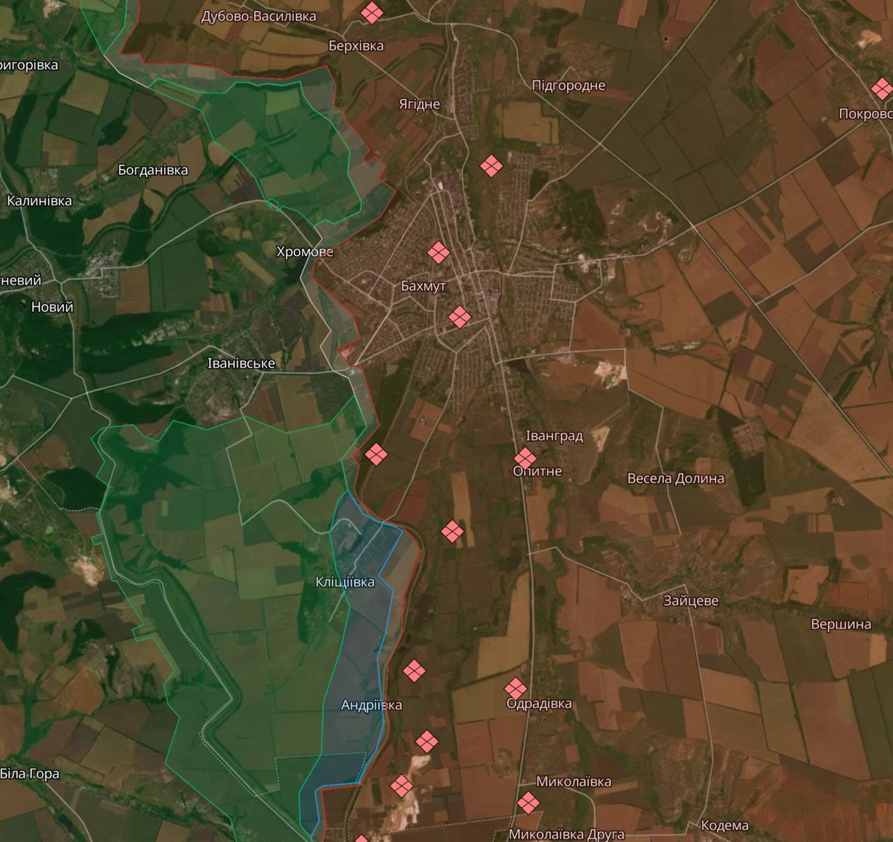 1. Бахмутское направление. Окружить город пока не получается. Освобождение Андреевки и Клещеевки на юге дает возможности для дальнейшего удара в сторону трассы на Горловку. На севере была допущена "стратегическая ошибка": штурм Берховки в пристрелянной низменности "дорого нам стоил", а инициатива перешла к РФ. Попытки пробить оборону РФ у Зализнянского и Раздоловки не принесли успеха.