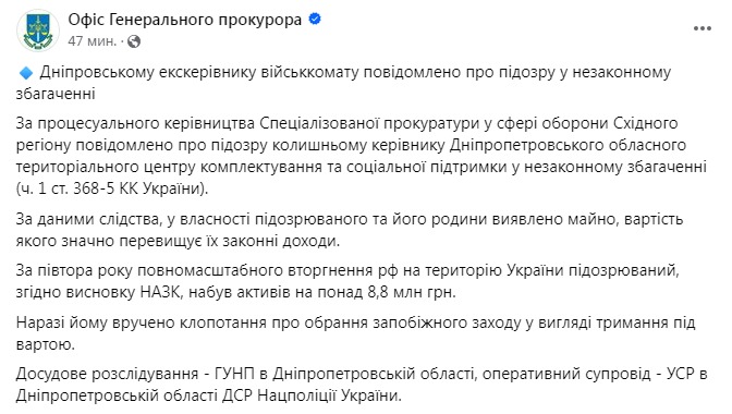 Нацполиция сообщила о подозрении бывшему военкому Днепропетровской области. Подозрении выдвинуто по ч. 1 ст. 368-5 (незаконное обогащение) Уголовного кодекса Украины.