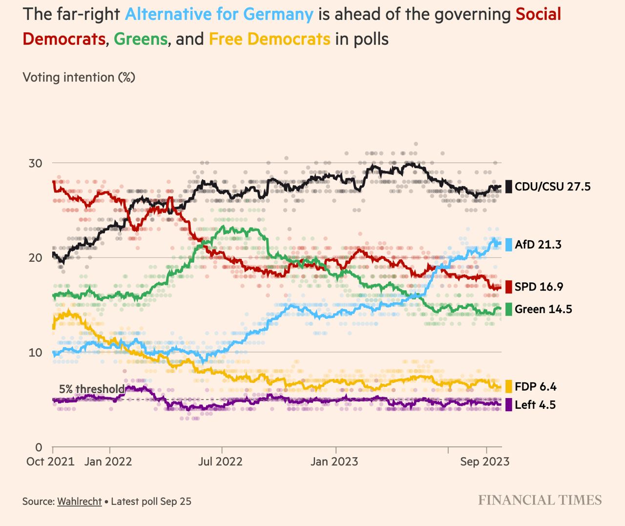 Также свою роль играет недовольство инфляцией, высокими ценами на энергоносители, а также гнев по поводу недавнего закона об ускорении перехода от газовых котлов к тепловым насосам.