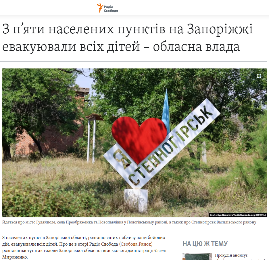 Принудительную эвакуацию детей из Преображенки, Егоровки, Гуляйполя, Новопавловки и Степногорска объявили еще 29 августа.