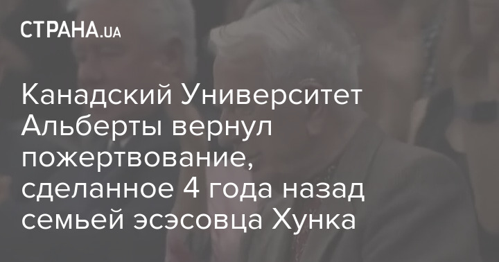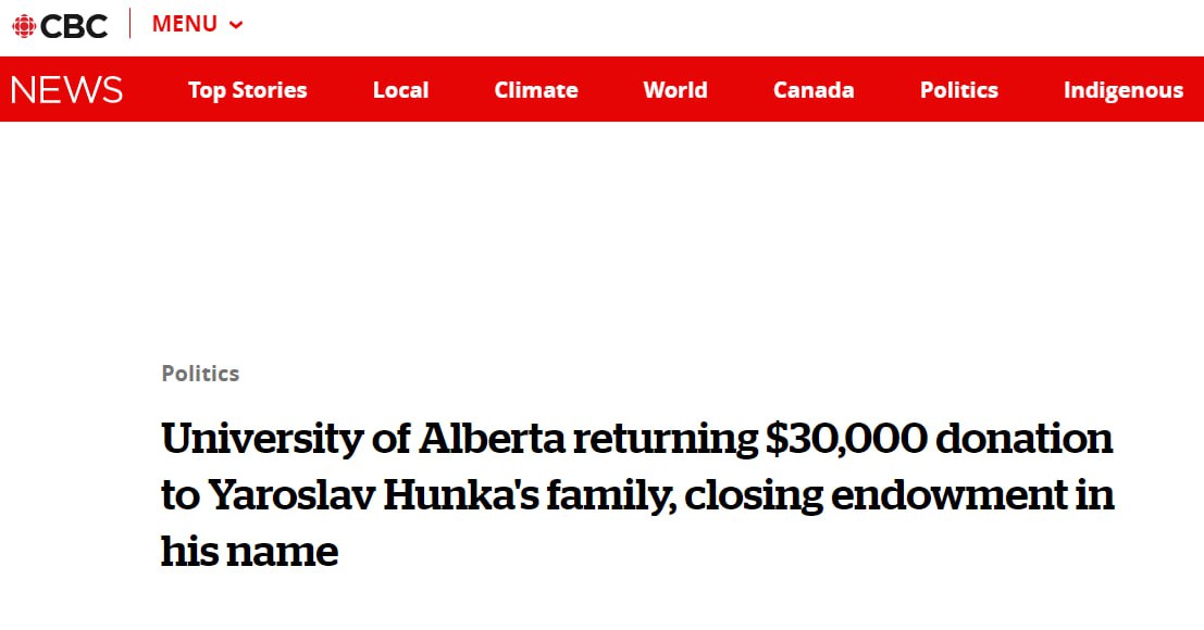 Канадский Университет Альберты вернул пожертвование в размере 30 000 канадских долларов (около 22 тысяч американских), полученное им от семьи Ярослава Хунка.