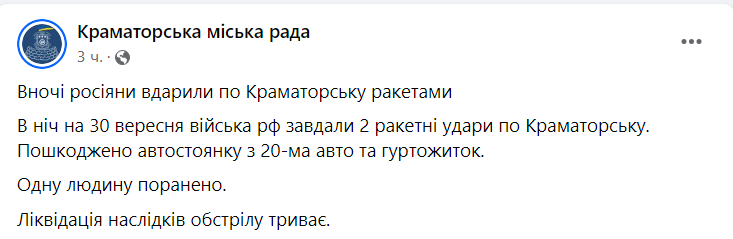 "В ночь на 30 сентября войска РФ нанесли 2 ракетных удара по Краматорску. Повреждена автостоянка с 20 авто и общежитие", - говорится в сообщении.