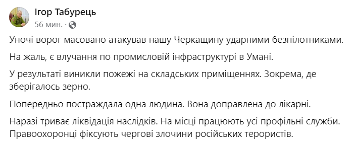 "Ночью враг массированно атаковал нашу Черкасщину ударными беспилотниками. К сожалению, есть попадания по промышленной инфраструктуре в Умани. В результате возникли пожары на складских помещениях. В частности, где хранилось зерно", -  написал Табурец.