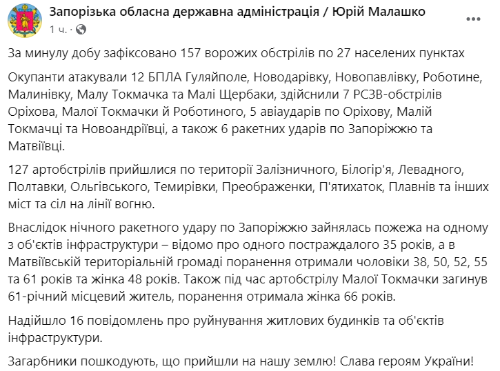 Сегодня ночью было шесть ракетных ударов по Запорожью и Матвеевке. Всего за минувшие сутки зафиксировано 157 вражеских обстрелов по 27 населенным пунктам Запорожской области.