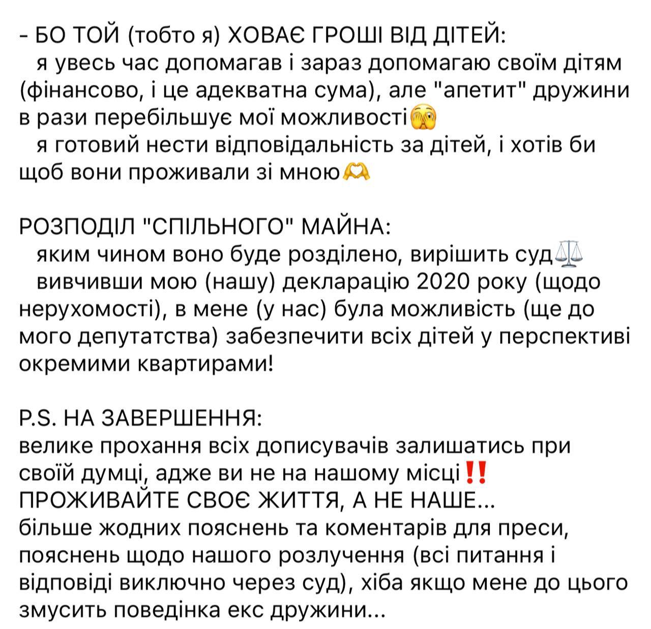 "Решение принял непосредственно я еще в начале октября 2022 года. Если меня не заставят, то вы никогда и не узнаете истинные причины нашего развода", - написал нардеп.
