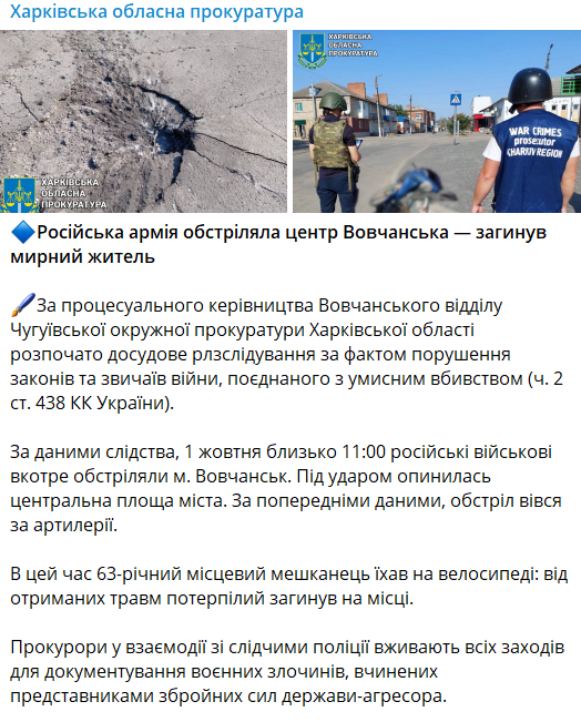 По данным следствия, 1 октября около 11:00 российские военные в очередной раз обстреляли Волчанск. Под ударом оказалась центральная площадь города. По предварительным данным, обстрел велся из артиллерии.