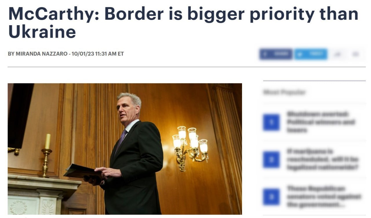 Спикер нижней палаты Конгресса США Кевин Маккарти заявил, что для него важнее укрепление границ Америки от мигрантов, чем помощь Украине.