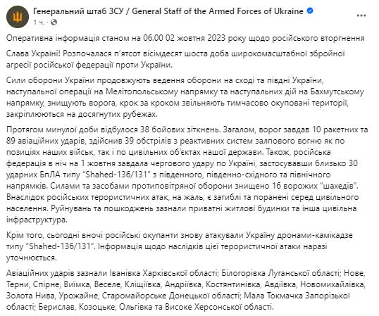 Всего враг нанес 10 ракетных и 89 авиационных ударов, совершил 39 обстрелов из РСЗО. РФ в ночь на 1 октября нанесла очередной удар по Украине, применив около 30 ударных БПЛА типа Shahed-136/131. Силами ПВО уничтожены 16 вражеских "шахедов".