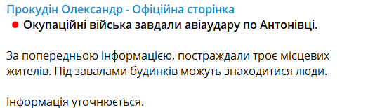 Сегодня днем российские оккупационные войска нанесли авиаудар по Антоновке Херсонской области, пострадали три человека.