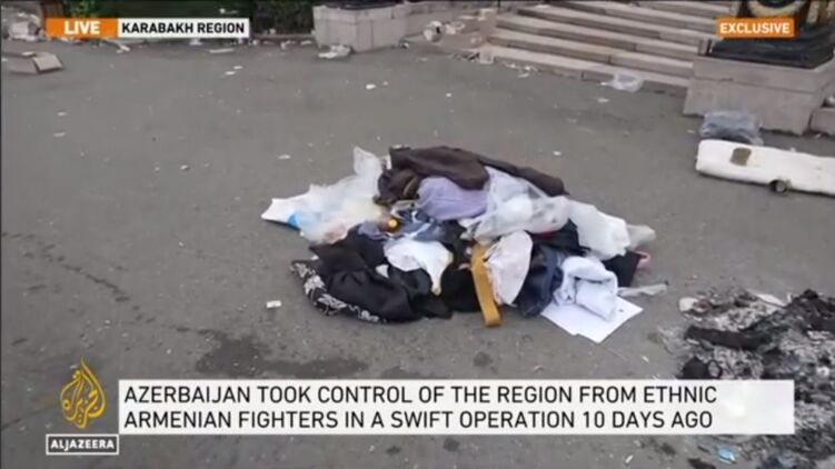 На кадрах телеканала Al Jazeera из Степанакерта видна пустая центральная площадь, заваленная мусором, брошенными детскими колясками и самокатами.