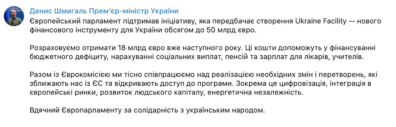 Европарламент поддержал создание Ukraine Facility - нового финансового инструмента для Украины на 50 млрд евро, которые могут быть выделены до 2027 года в обмен на реформы.