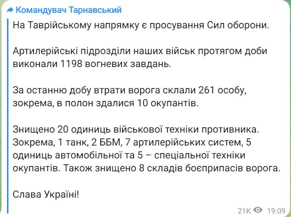 Между тем командующий оперативно-стратегической группировкой войск "Таврия" Александр Тарнавский сообщил, что на Таврийском направлении есть продвижение сил обороны.