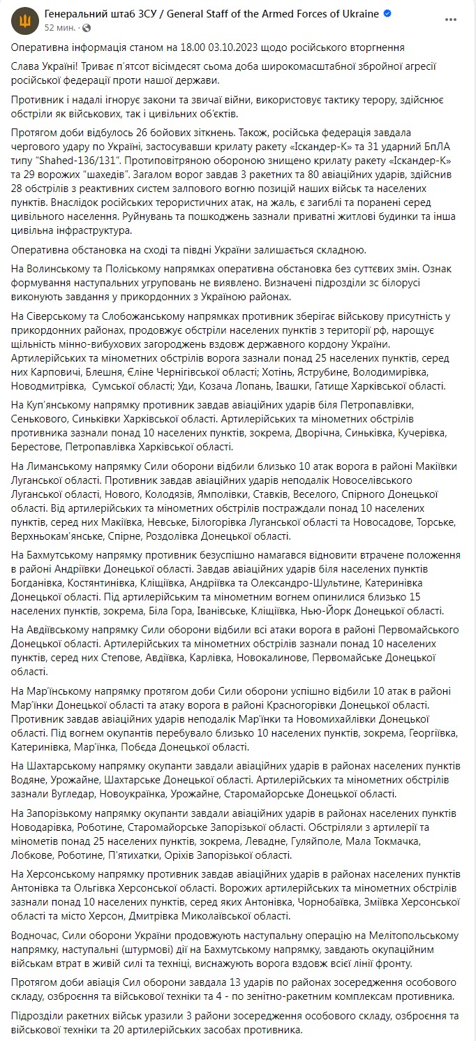 Генеральный штаб ВСУ опубликовал оперативную информацию о ситуации на фронте по состоянию на 18:00 3 октября.