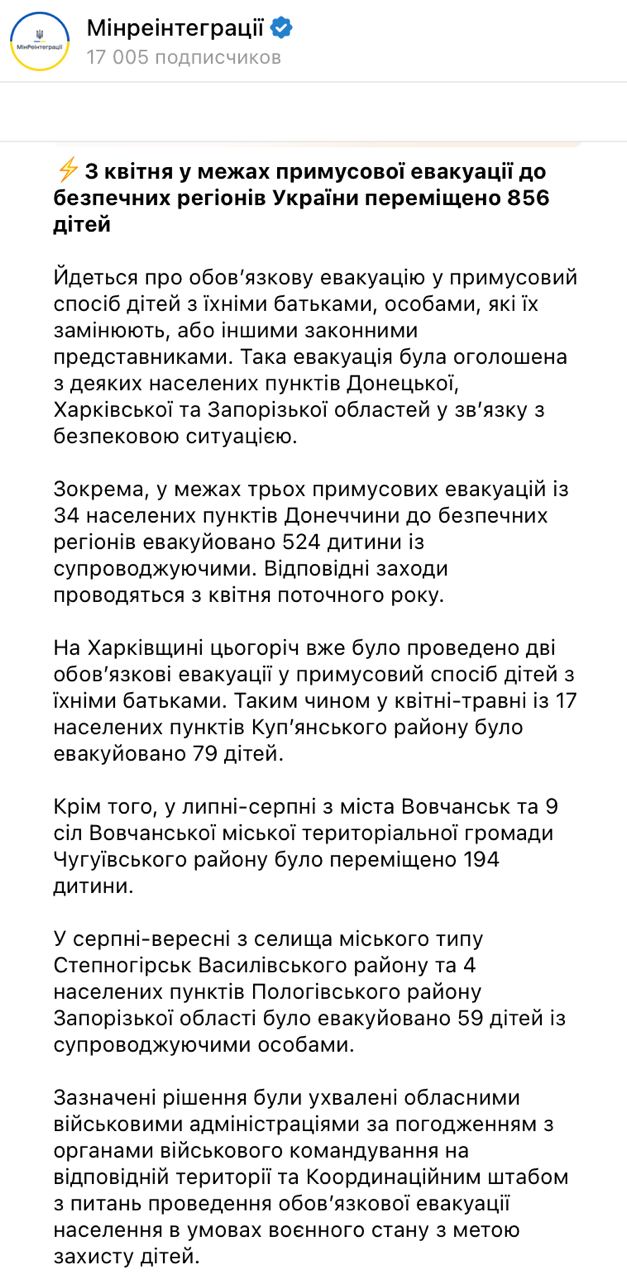 09.20 С апреля с прифронтовых регионов принудительно переселили 856 детей, сообщает Минреинтеграции.