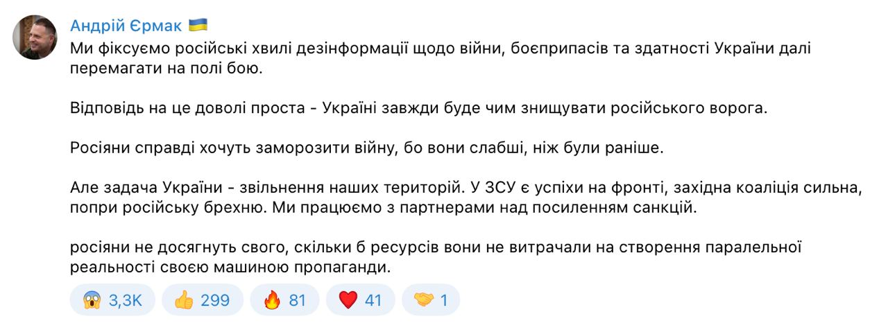 "Мы фиксируем российские волны дезинформации о войне, боеприпасах и способности Украины дальше побеждать на поле боя. Ответ на это достаточно прост – Украине всегда будет чем уничтожать российского врага. Россияне действительно хотят заморозить войну, потому что они слабее, чем раньше", - пишет Ермак.