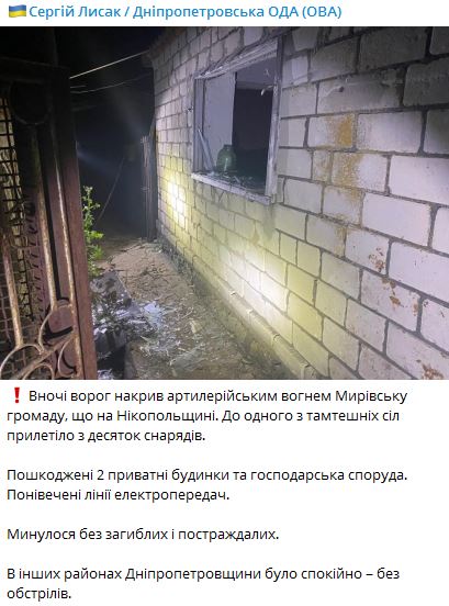 07.32 Ночью россияне накрыли артиллерийским огнем Мировскую громаду Никопольского района Днепропетровской области.