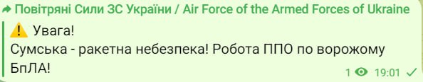 19:02 Ракетная опасность для Сумской области, сообщают Воздушные силы.