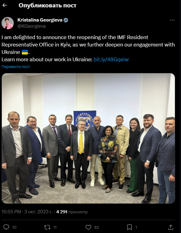 "Я рада объявить об открытии вновь постоянного представительства МВФ в Киеве, поскольку мы еще больше углубляем наше взаимодействие с Украиной", – написала она в соцсети Х в ночь на среду.
