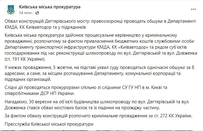 В четверг, 5 октября, силовики проводят обыски в Киевской городской государственной администрации (КГГА) и на предприятиях в связи с обрушением Дегтяревского моста в Киеве.