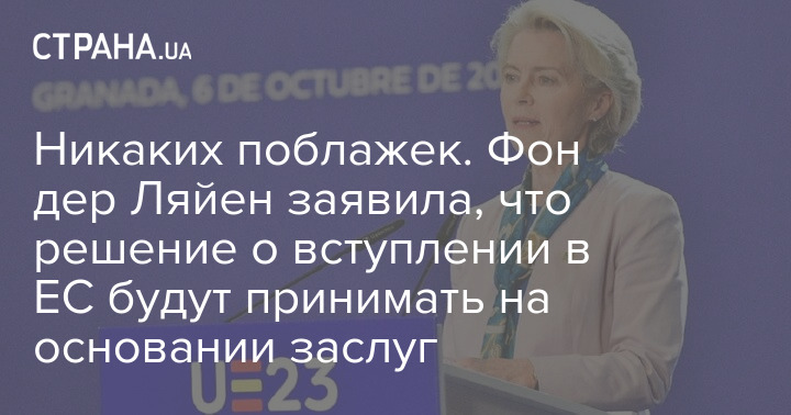 "Процесс приема новых членов будет осуществляться исключительно на основании заслуг, никаких поблажек не будет. Еврокомиссия представит в начале ноября подробный доклад о степени готовности к вступлению, он будет рассмотрен на саммите в декабре", - сказала фон дер Ляйен.
