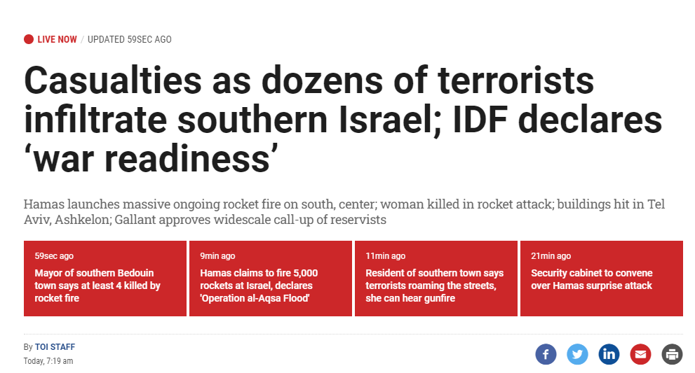Известно, что идут уличные бои на юге Израиля (в частности, в городе Сдерот), есть данные о погибших израильских военных, а также взятых в плен. Израильская авиация начала удары по сектору Газа.