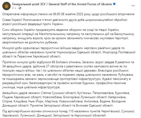 Утром 8 октября Генштаб ВСУ обнародовал сводку о ситуации на фронте.