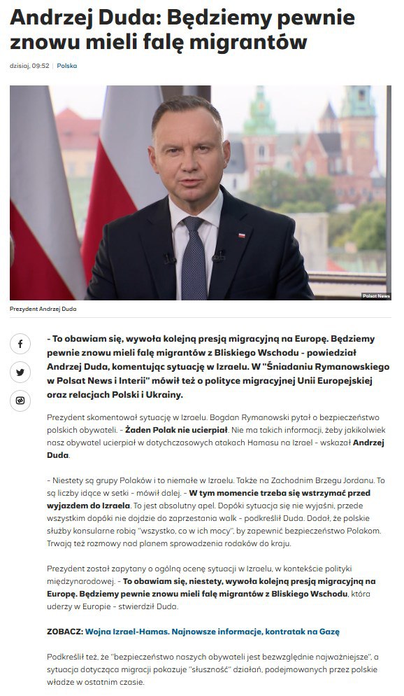 "Это, безусловно, выгодно России и российской агрессии против Украины. Это отвлекает внимание мира... Но, прежде всего, я боюсь, что это, к сожалению, вызовет дальнейшее миграционное давление на Европу. Скорее всего, нас ждет еще одна волна мигрантов с Ближнего Востока, которая поразит Европу... Наша безопасность, защита границ Польши, конечно, а также границ Европейского Союза и Шенгенской зоны, становится еще более важной", - заявил Дуда.