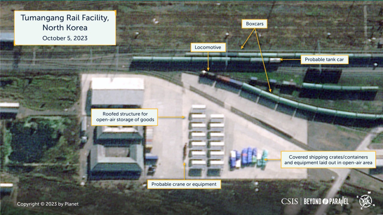 Спутниковые снимки железнодорожного пункта Туманган на границе КНДР с РФ показывают "беспрецедентное количество" грузовых вагонов за 5 октября - около 73 вагонов.