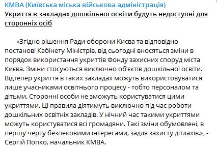 По решению Совета обороны Киева с 9 октября вносятся изменения в порядок использования укрытий Фонда защитных сооружений города Киева. Эти изменения касаются объектов дошкольного образования.