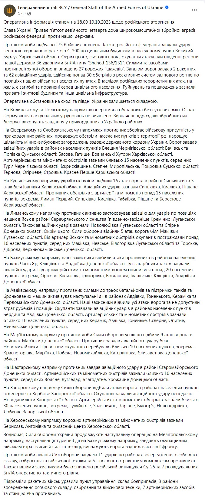 Во вторник, 10 октября, в Украине идет 594-й день войны с Россией.