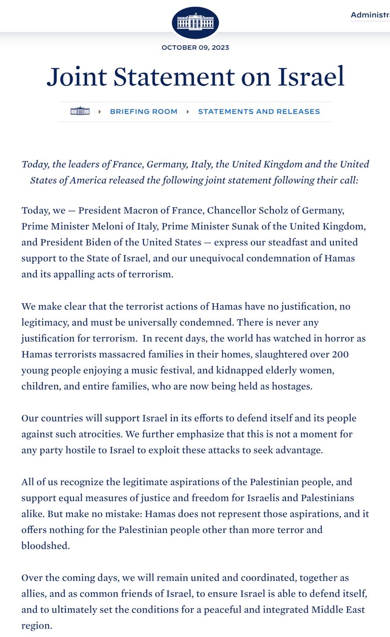 Белый дом опубликовал совместное заявление Франции, Германии, Италии, Британии и США касательно вторжения ХАМАС в Израиль.