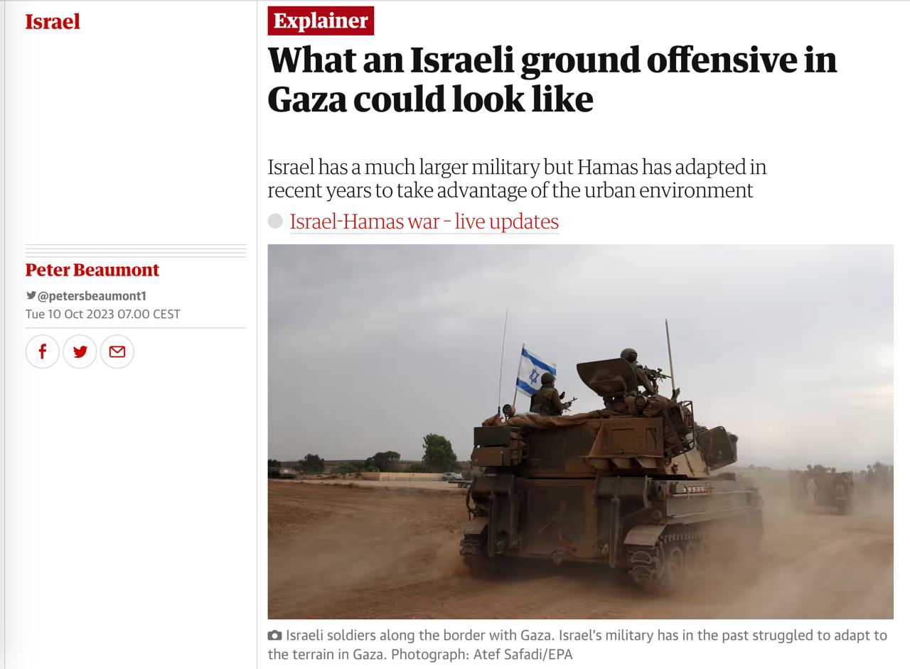В The Guardian вышел материал, где обозреватель Питер Бомонт проанализировал, как может выглядеть наземное наступление Израиля в секторе Газа и какие у него перспективы.
