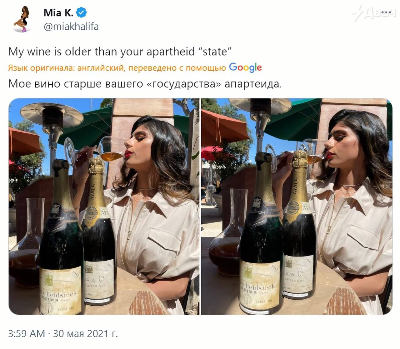 В 2021 году она опубликовала пост со словами "мое вино старше вашего "государства" апартеида".